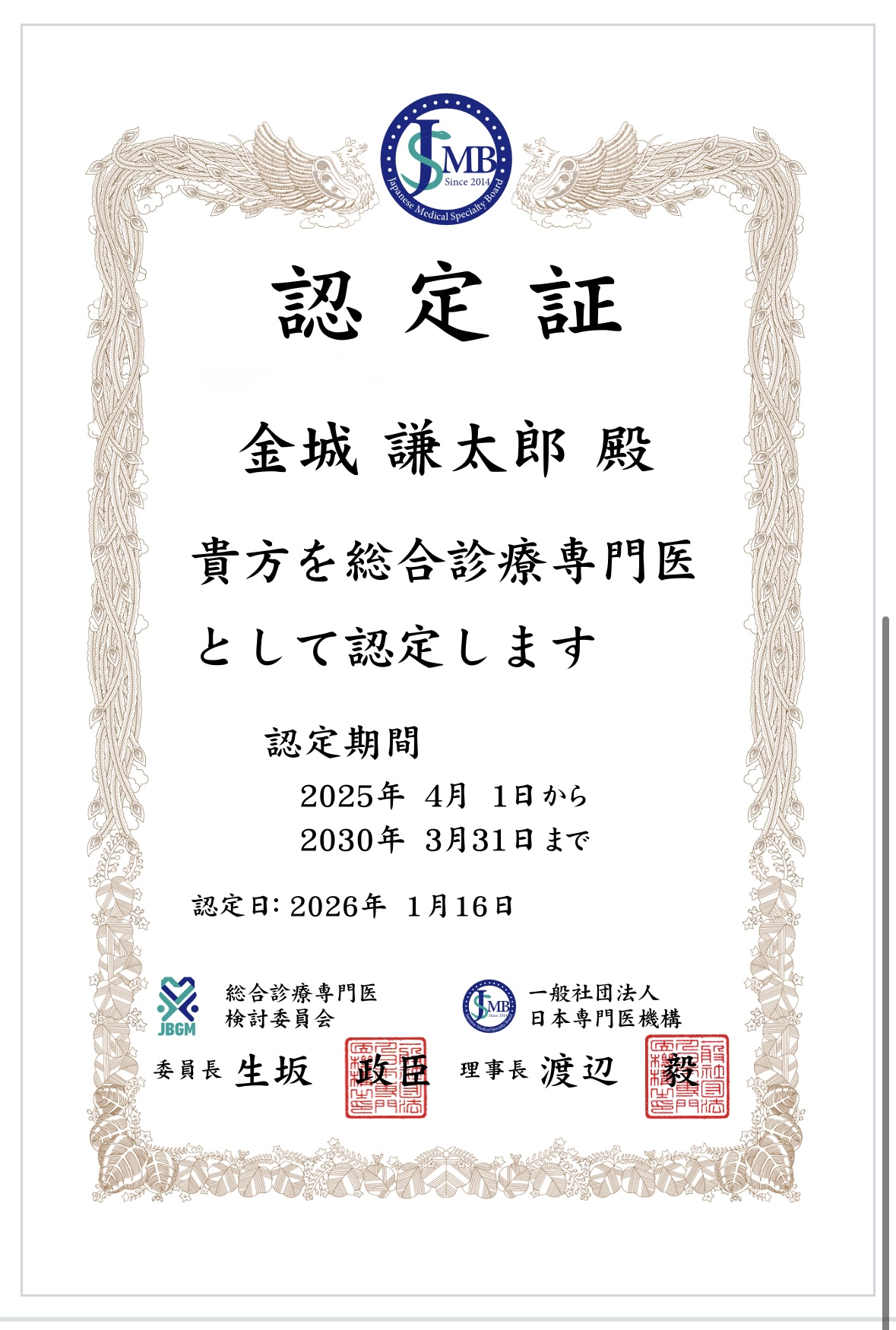 すでに日本プライマリ・ケア学会認定の家庭医療専門医(小児科、内科、在宅医療、簡単な縫合術などの外科領域、膝の関節注射などの整形外科領域、更年期障害などの女性の健康問題や前立腺がん検診など男性の健康問題など、老若男女の健康問題なら対応。)と指導医の資格や、総合診療科指導医、総合内科専門医・指導医、在宅医療専門医・指導医でした。今回、試験に合格したため総合診療科専門医として、赤ちゃんからご高齢の方までの健康問題の解決を、さらに地域で尽力していきます。ご遠慮なくなんでもご相談下さい。今後ともどうぞよろしくお願いします。